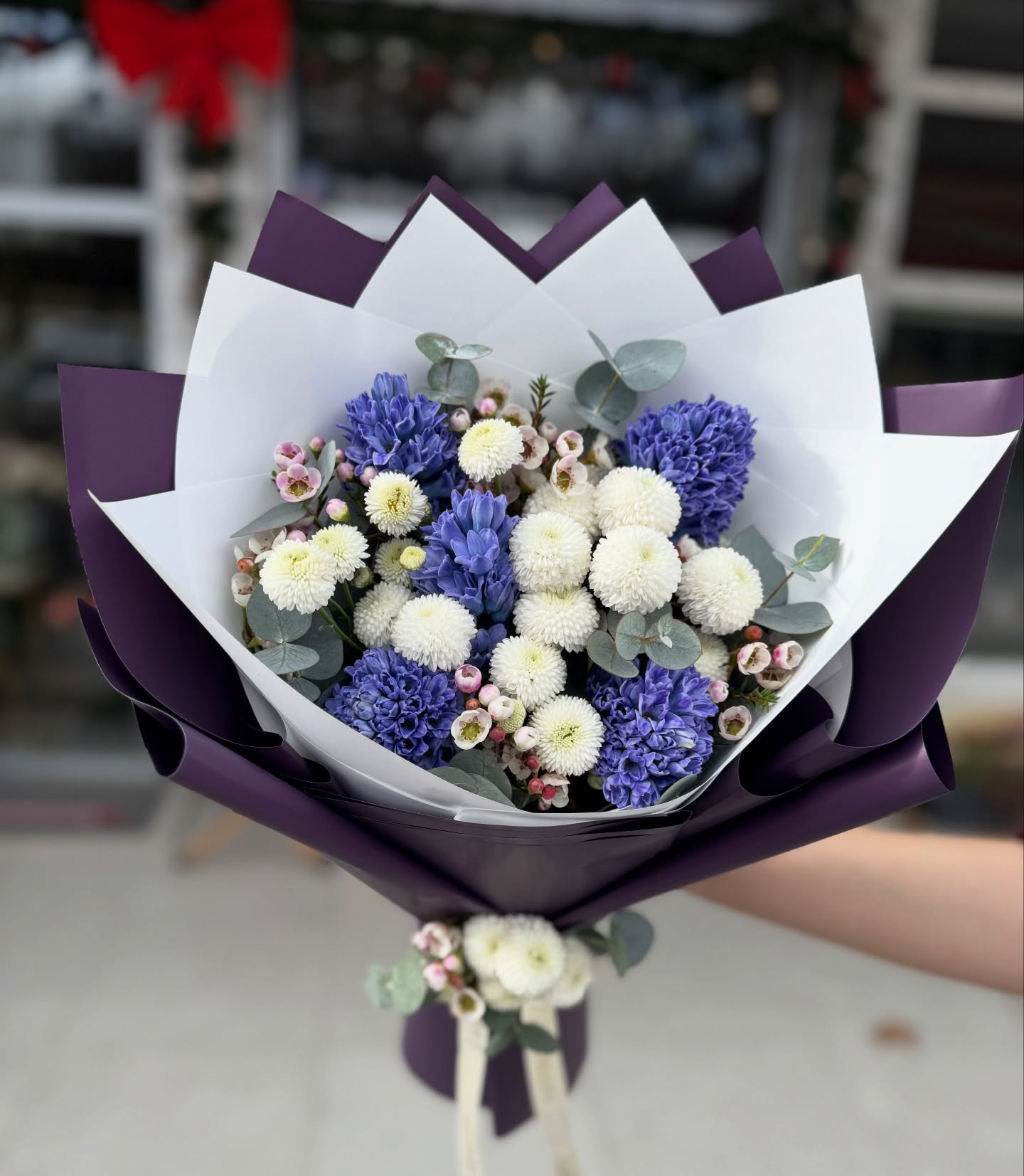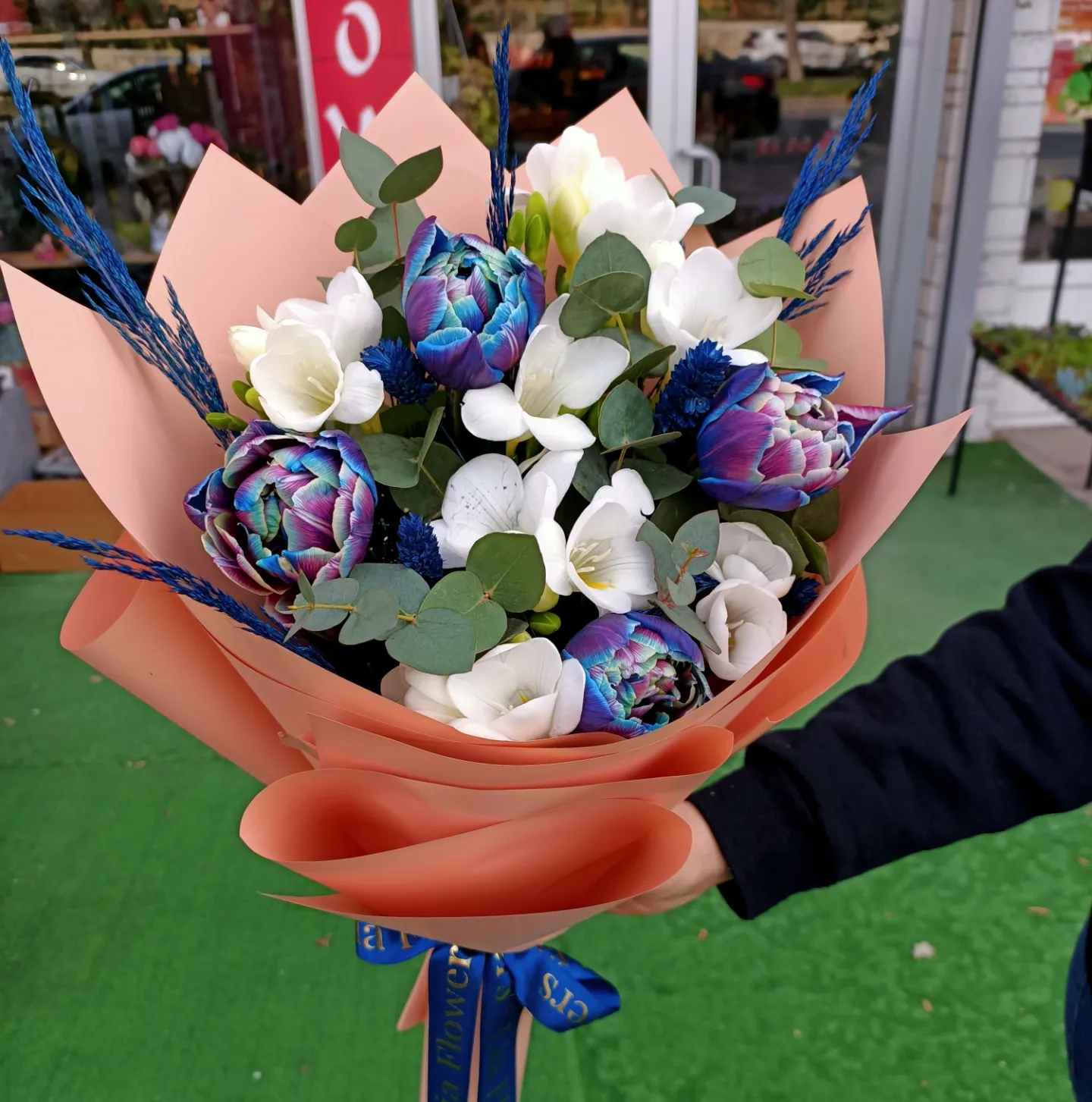 Mavi lale ve beyaz frezya Buketi