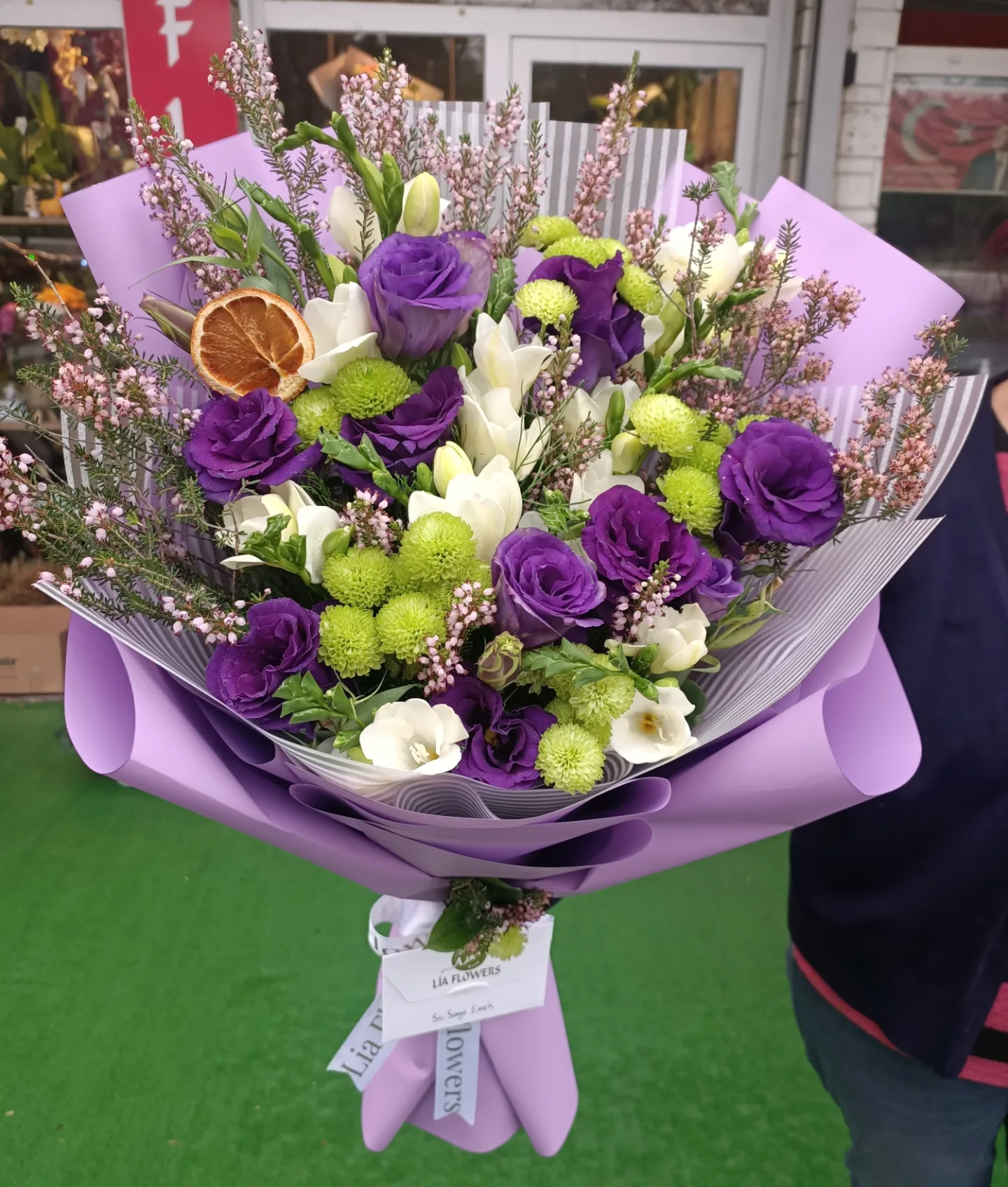 Beyaz frezya ile mor lisyantus Buketi