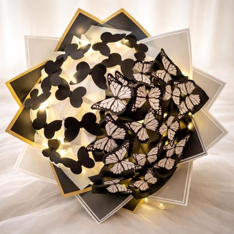 Siyah Beyaz Kelebekli LED Işıklı Buket
