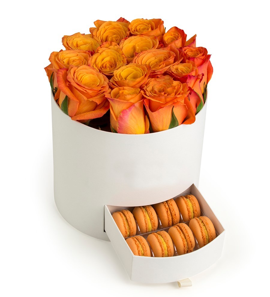 Beyaz Kutuda Macaronlu Turuncu Gül