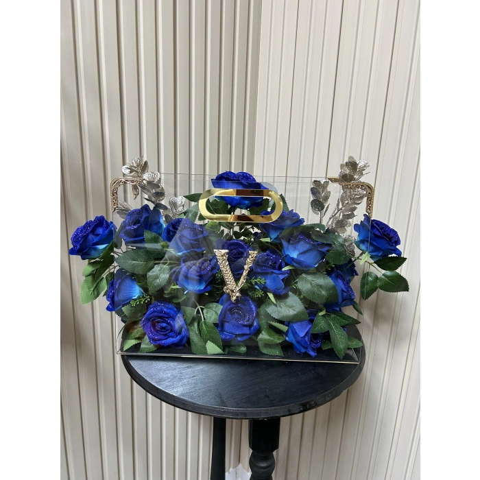 Premium Çantada Simli Mavi Kadife Güller